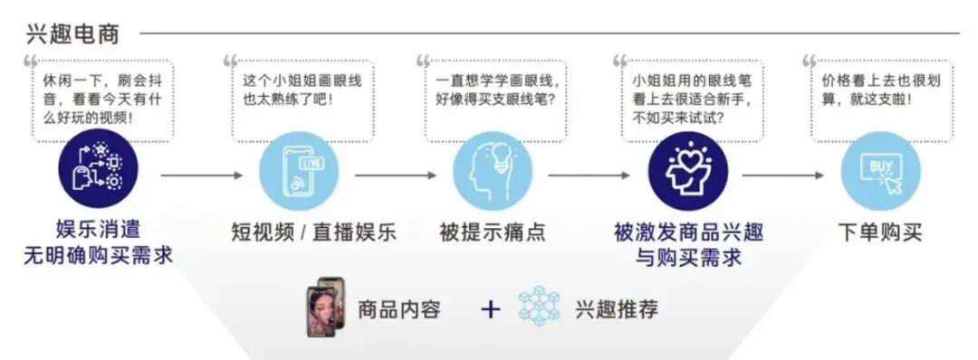 首先我们了解一下抖音电商的经营逻辑,也就是兴趣电商的逻辑。用户是无明确购买需求只是娱乐消遣,这时用户看短视频/直播娱乐,结果这个过程中被提示痛点,被激发商品兴趣和购买需求,最终实现下单购买的过程,这就是商品内容+兴趣推荐的抖音电商逻辑。