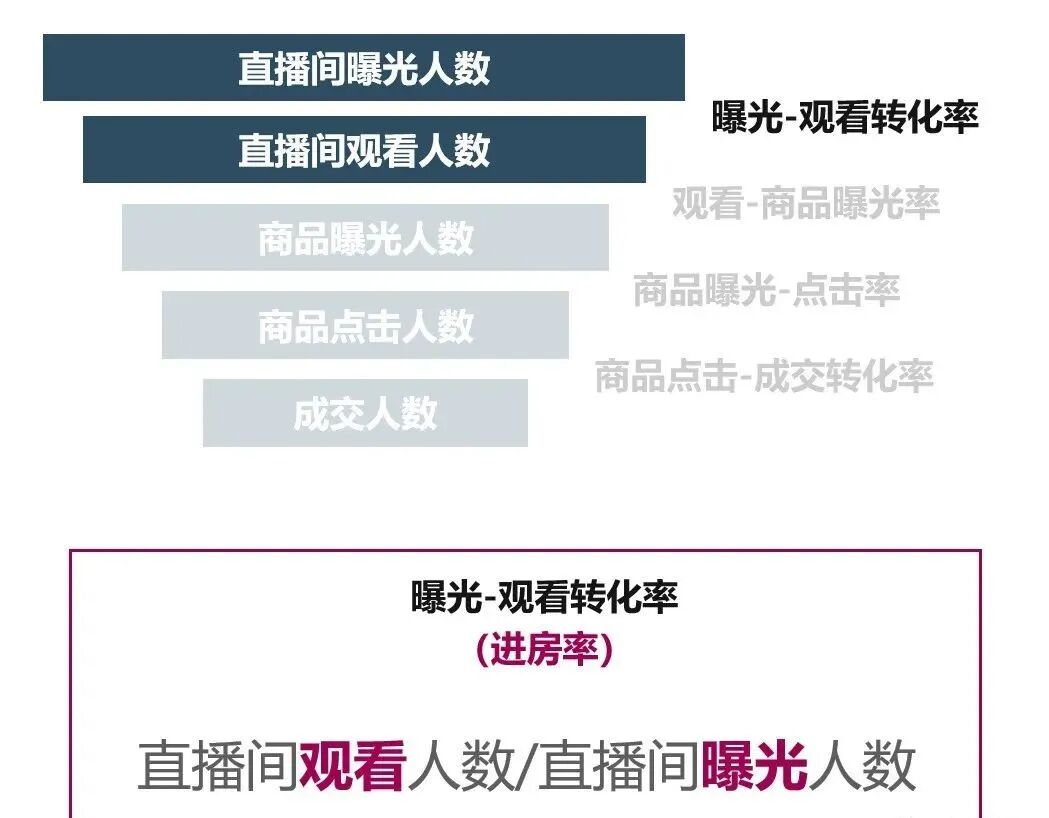 进房率就是曝光观看转化率,就是我们直播间成交转化漏斗的第一个率,曝光观看转化率=直播间观看人数/直播间曝光人数。