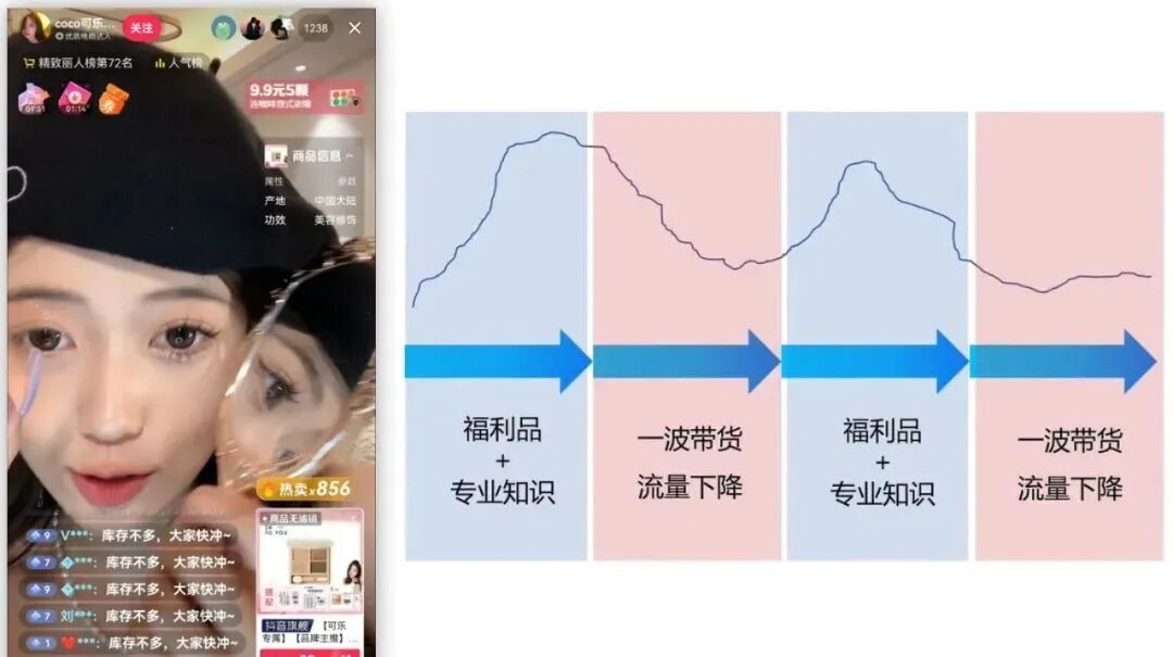 专业型内容达人直播玩法,通过福利品+专业讲解留人,人均看播时长能够持续在3分钟左右。