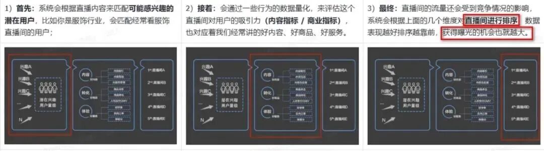 直播间流量分发的逻辑:首先匹配可能感兴趣的用户,然后是通过行为数据(用户停留时长、互动率)和商业数据(商品转化率、客单价、成交密度)判断直播间的吸引力,最后对比多个直播间进行排序数据表现好的就获得更多曝光机会。