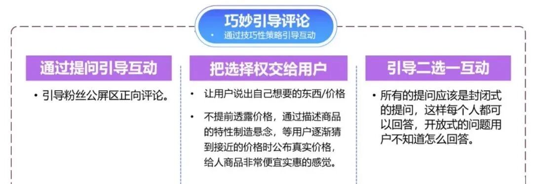 主播引导互动评论有三种方法:通过提问引导互动,引导粉丝公屏区正向评论,把选择权交给用户,让用户说出自己想要的东西/价格,引导用户二选一互动,所有的提问都应该是封闭式的提问,让每个人都可以回答。