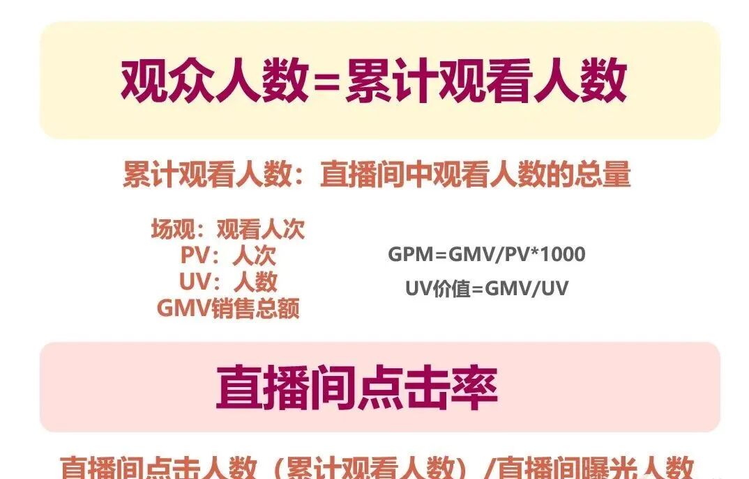 累计观看人数就是直播间观看人数的总量,也就是观众人数。场观是观看人次、PV是人次,UV是人数,GMV是销售总额,GPM=GMV/PV*1000,UV价值=GMV/UV。