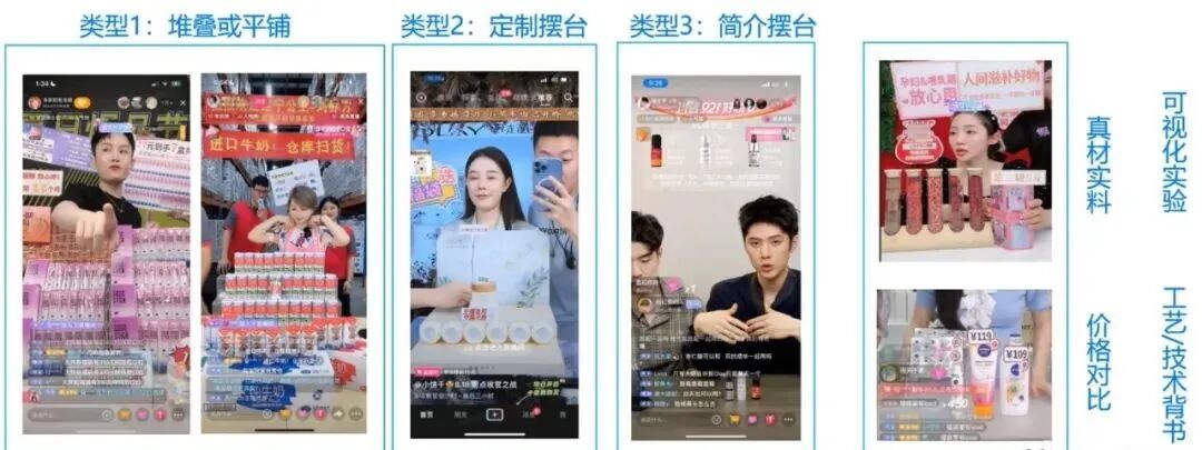 商品讲解主要是主播的讲解方式和商品呈现的场景设计,可以使用下面的几种方式:1)商品堆叠/平铺,2)定制摆台,3)简介摆台等。可视化试验、工艺/技术背书,真材实料,价格对比讲解方式增加商品转化率。