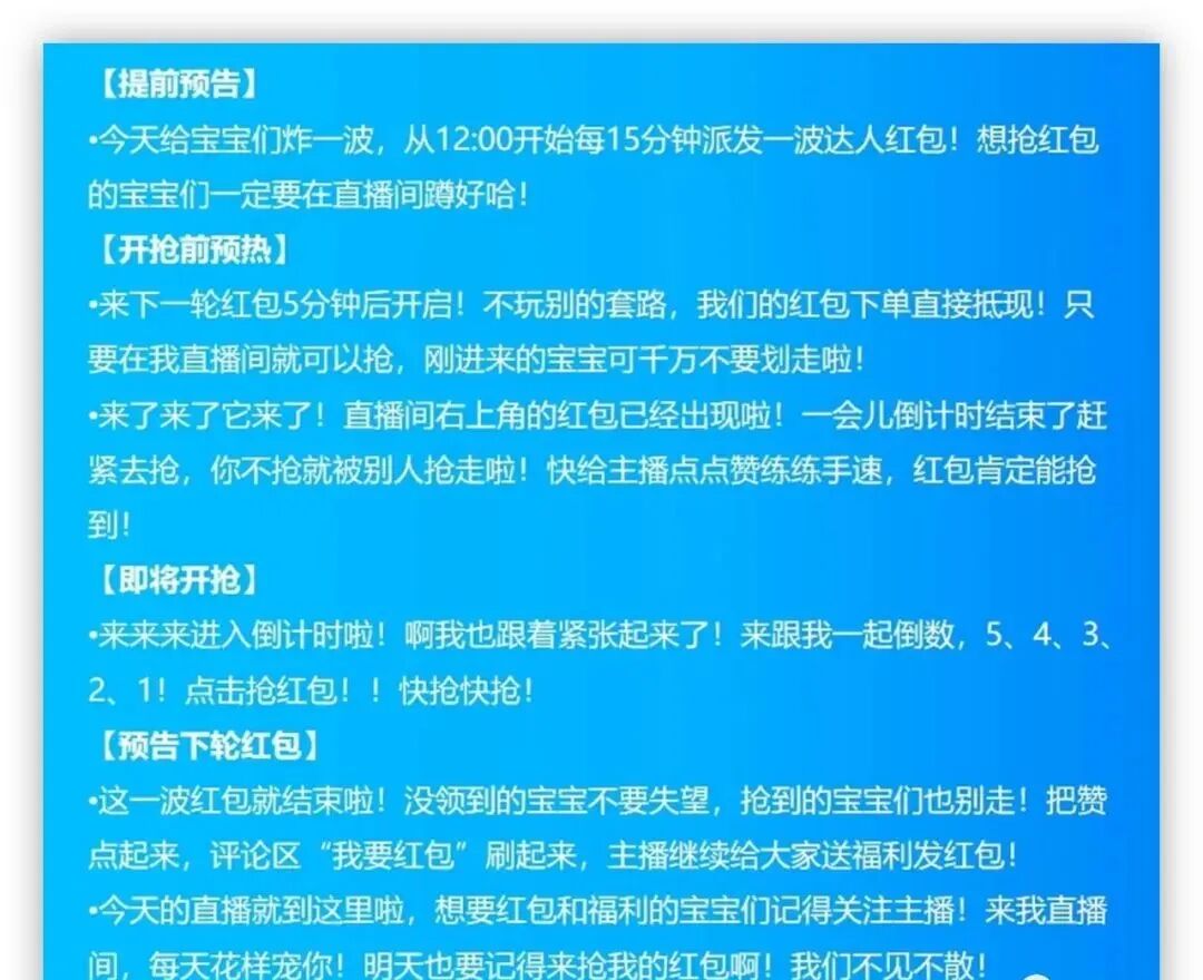 高频引导观众关注红包:提前预告、开抢前预热、即将开抢,预告下轮红包。