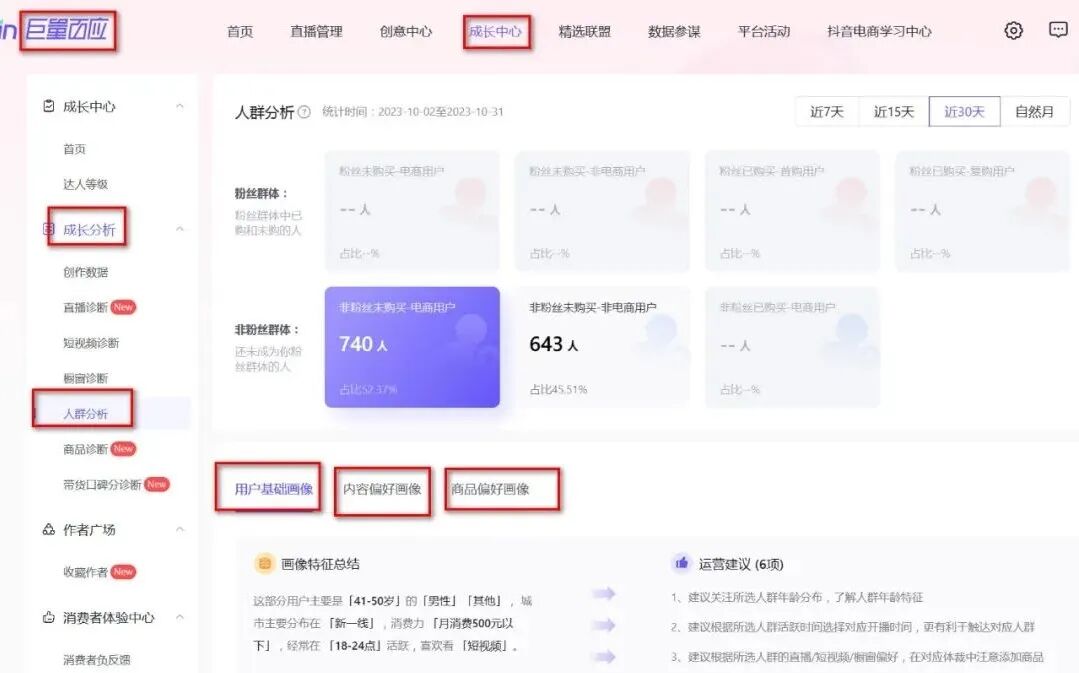 当然如果我们是达人,选品时也要看看我们的账号的人群画像:用户基础画像、内容偏好画像、商品偏好画像。登录巨量百应平台-成长中心-成长分析-人群分析。