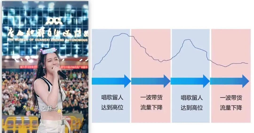 才艺型达人直播玩法。通过唱歌留人,拉直播间平均停留时长。