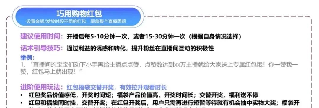 巧用购物红包提升直播间的评论率和加团率。购物红包使用的方法可以看上面的使用时间和话术引导。