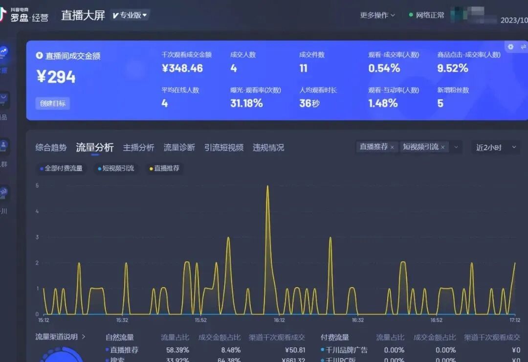 2)直播间流量数据:整体流量转化漏斗,不同流量渠道的转化效率、分钟级趋势变化,短视频引流数据。