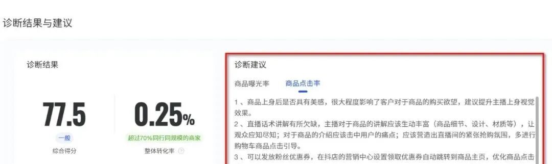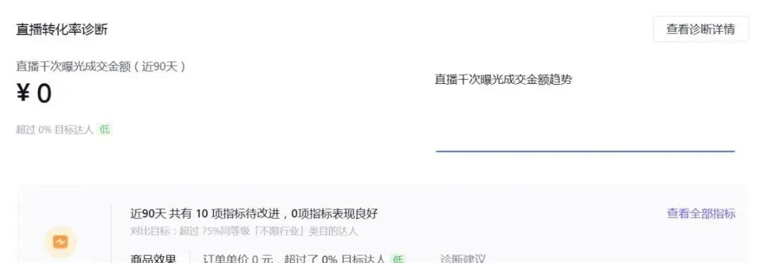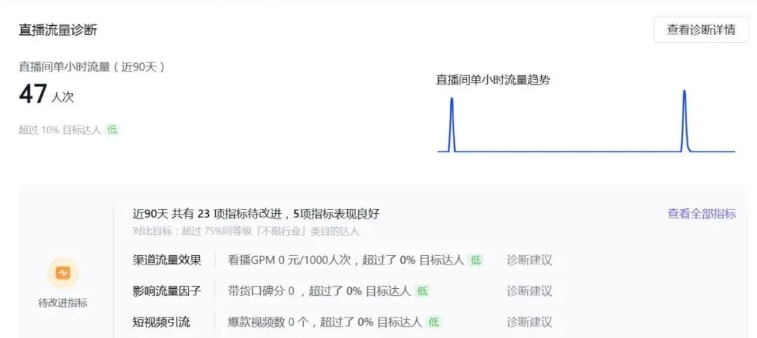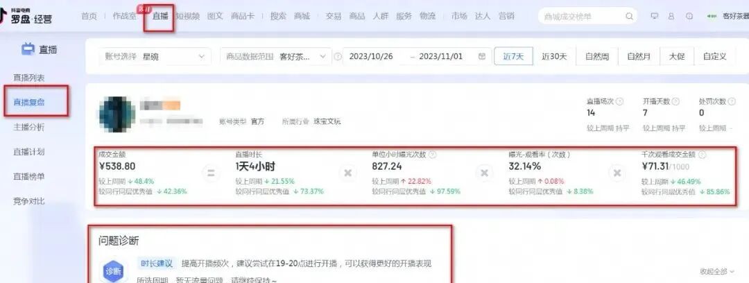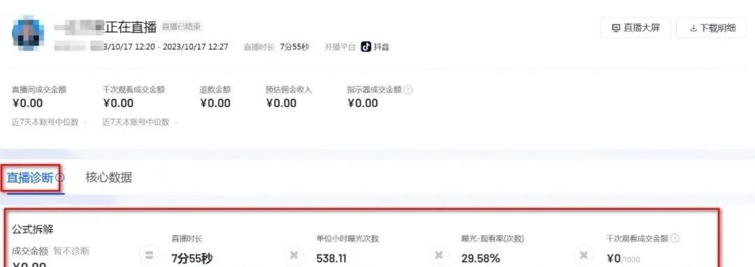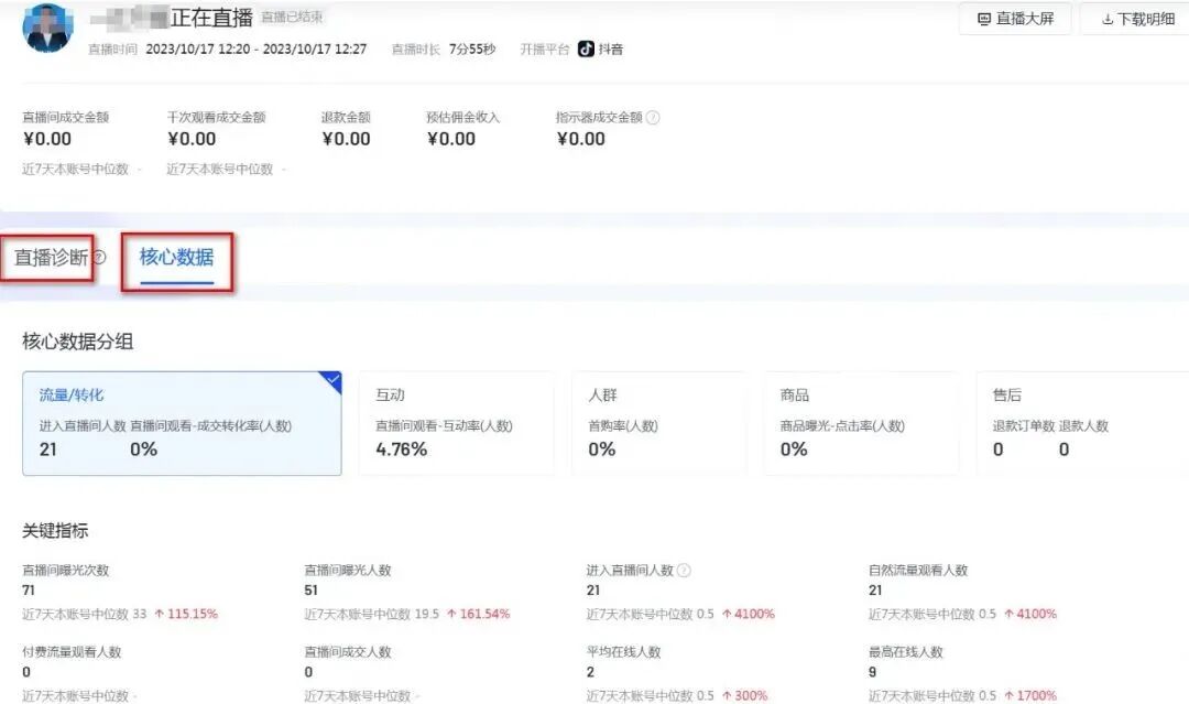 可以单独查看一场直播的单场诊断,可以查看到直播诊断和核心数据。