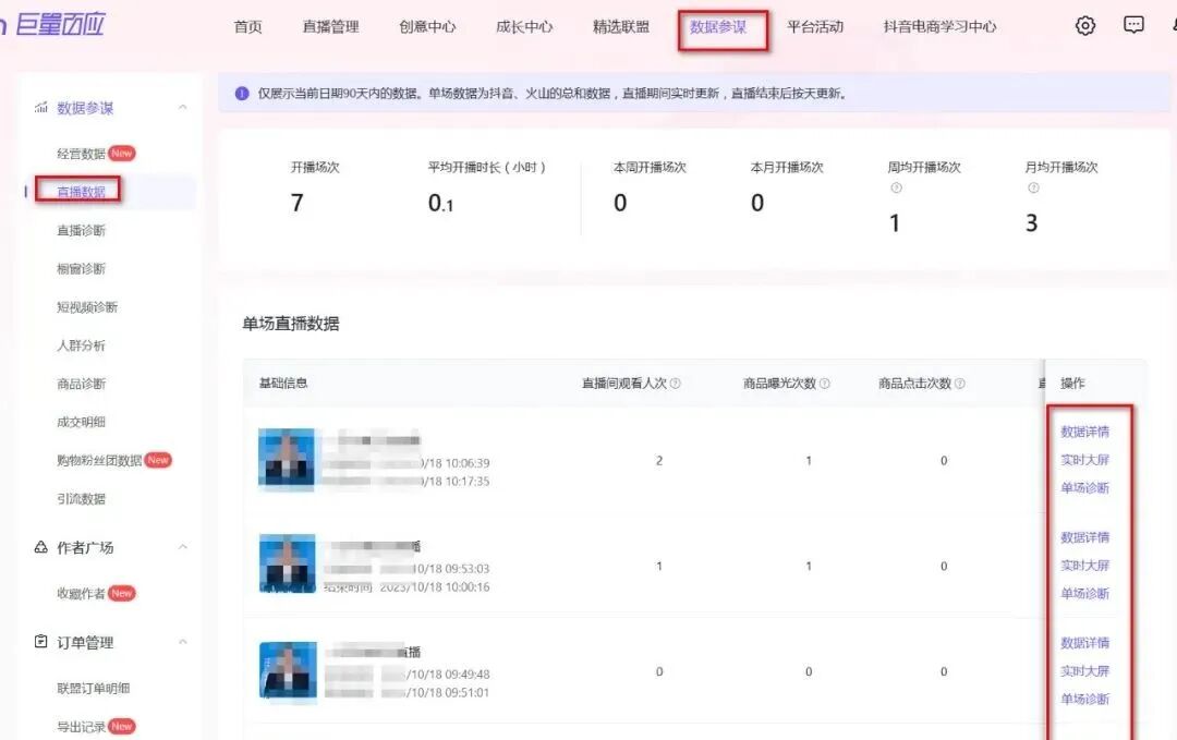 也可以在巨量百应中的数据参谋中的直播数据里面看到直播场次。