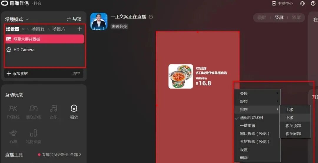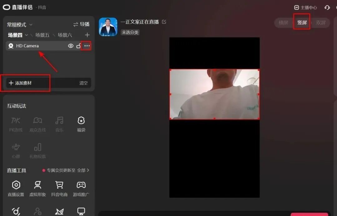 首先我们切换到竖屏模式,然后在右上角添加素材,选择摄像头,当然右击实际的摄像头,可以调整比例等等。
