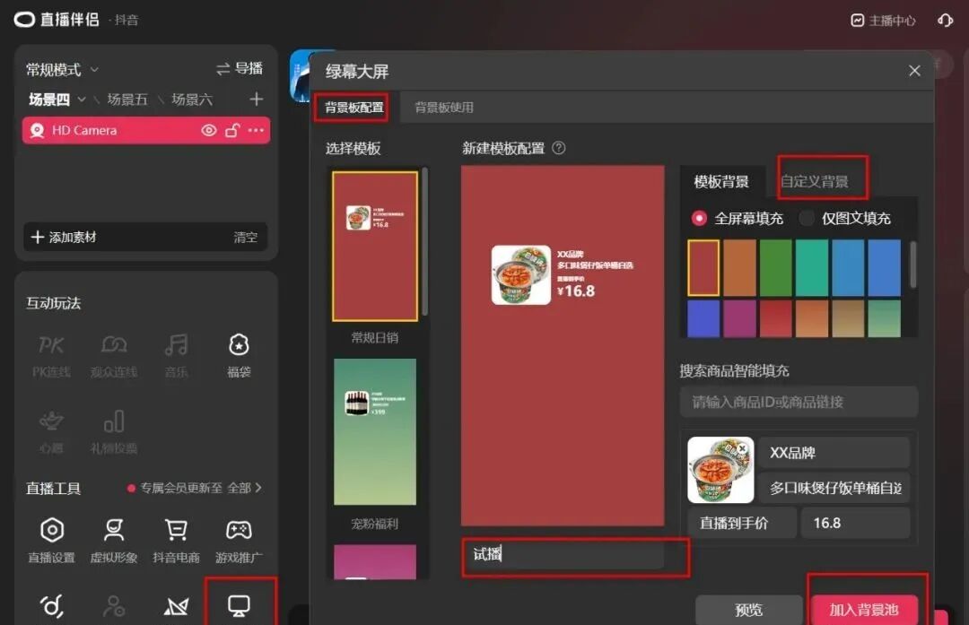 然后点击绿幕大屏,设置背景,可以自定义背景,需要提前设计好背景图,然后添加到背景池。