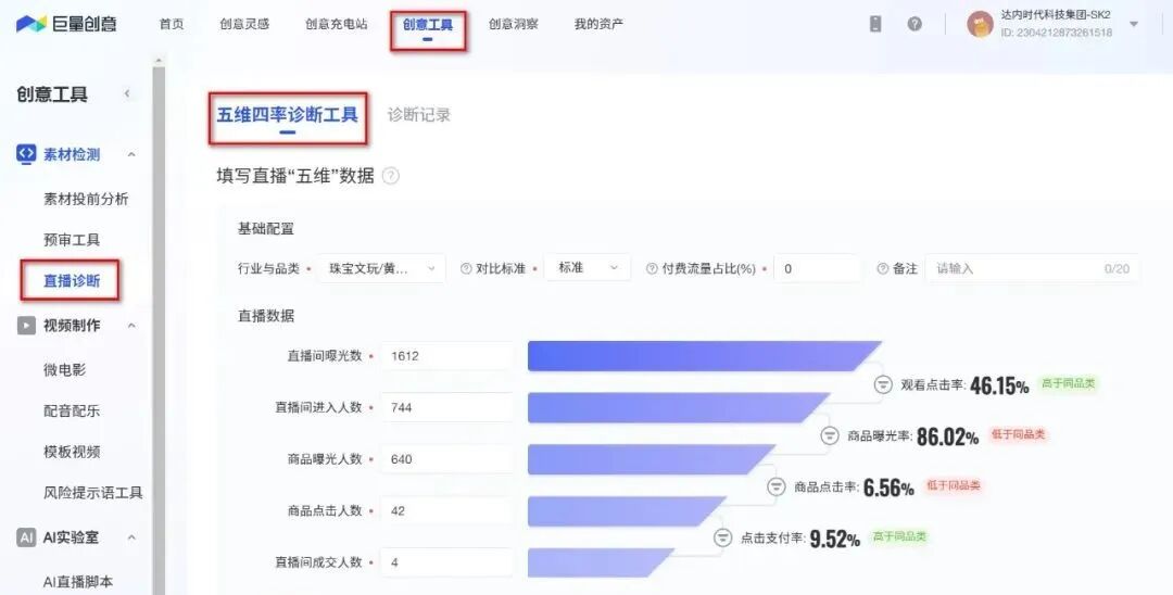 在五维四率的数据中选择类目,设置付费流量占比,输入数据。数据来源:根据当场直播流量占比填写,否则影响诊断结果。五维数据查看方式:抖店后台->电商罗盘->直播列表->直播间明细(选择单场直播)->详情->流量分析->按人数看。