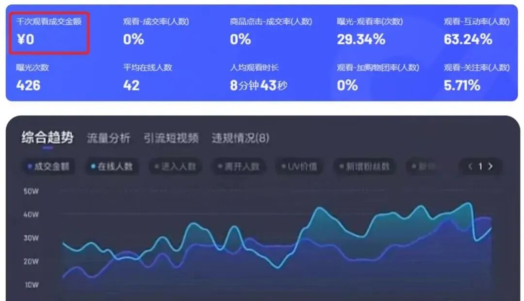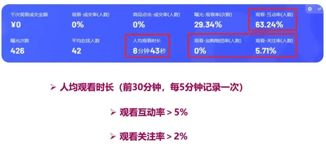 1)直播间核心指标:看播率、关注率、互动率、转粉率、人均观看时长、千次观看成交金额等各项核心指标。