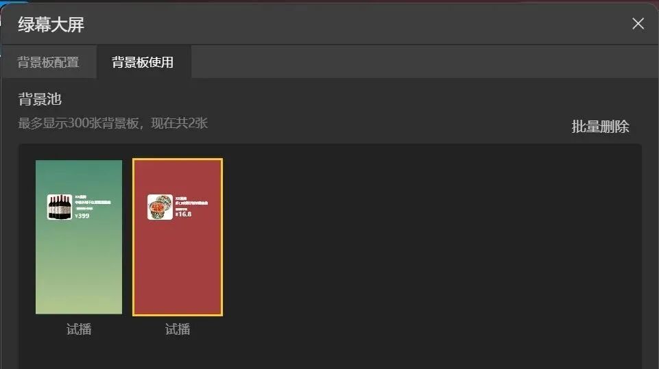 最后点击背景板使用,选择刚才设置的背景板添加到直播画面中。