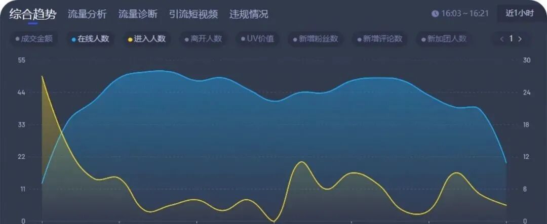 专业版直播大屏看下图:黄线(进入人数)和蓝线(在线人数)之间的差值,极速流承接50%以上。