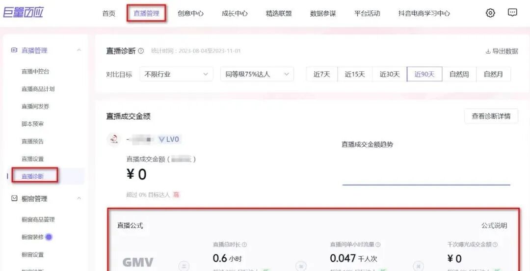 巨量百应可以查看具体直播场次的问题,进入【巨量百应】后台,点击【直播管理】,选择直播管理的【直播诊断】,页面将会显示平台对于这一整场直播的诊断。