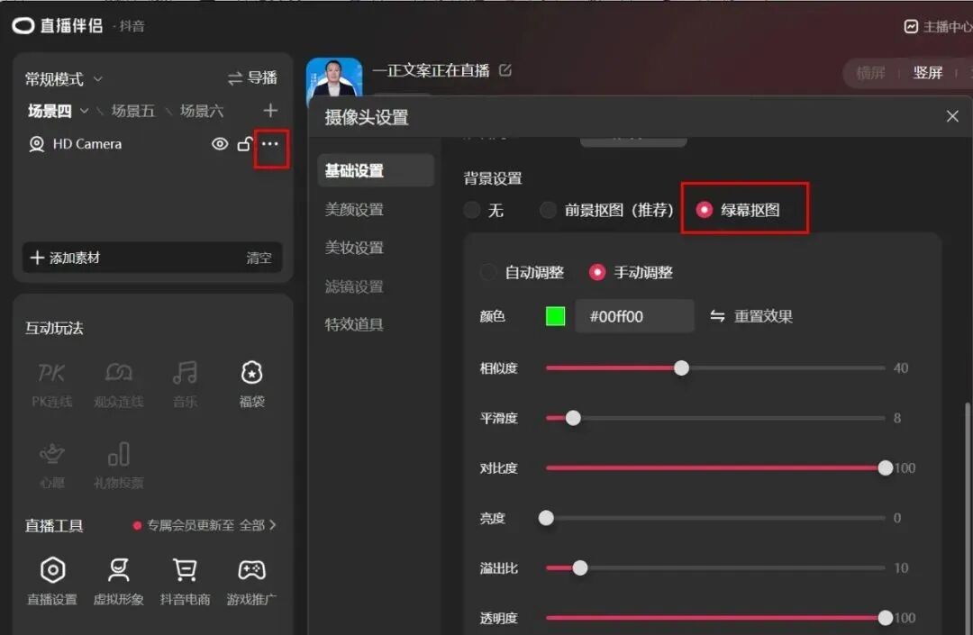 之后我们打开摄像头设置,点击图中最左侧上面的...,然后设置,这样摄像头设置项就出现,在基础设置中,往上拉就可以看到背景设置,选择绿幕抠图。