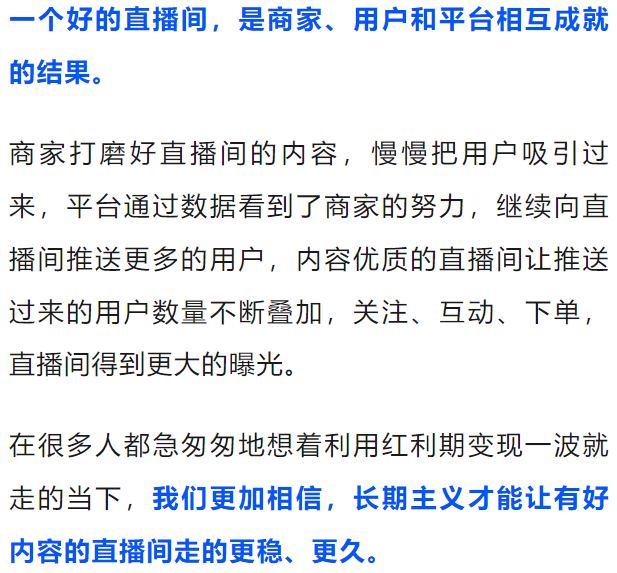 那些几万人在线的直播间,并不是因为平台一下子给他推了几万人,而是这个直播间把平台每次推给他的人都稳稳地接住了,每次的一点点,累积起来,就形成了万人在线的大场面。
