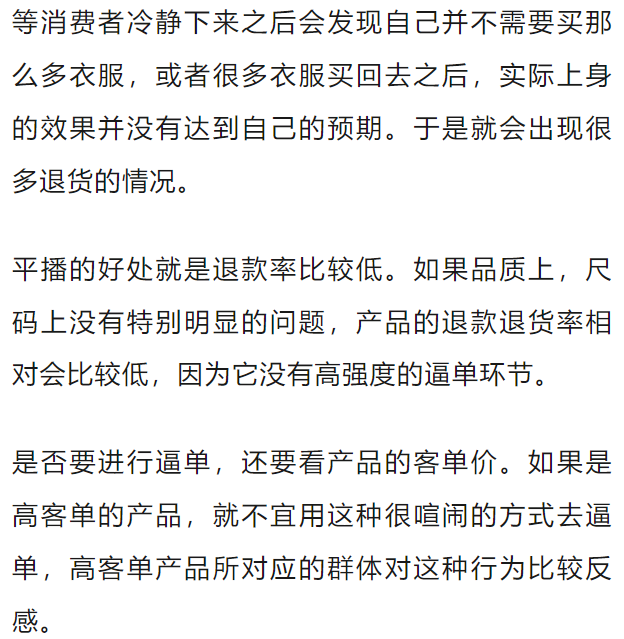 当然这种逼单方式是有利有弊的。很多销售能力强的主播,当场的成交数据会非常好,但是我们会发现,下播之后,退货率也非常高。