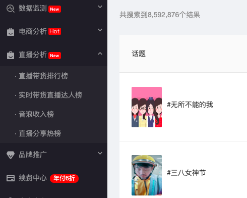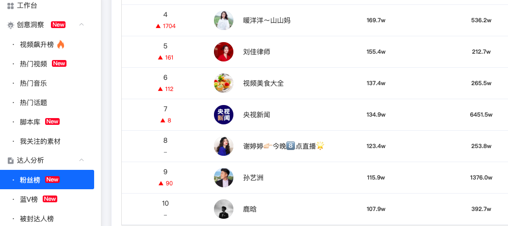 目前市面上有多款抖音数据分析工具,基本都包含达人、热门视频、热门商品等榜单数据。