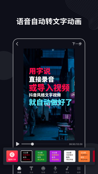 字说不仅可以制作动态文字视频,还可以改变声音,支持输入文字自动转换为声音。