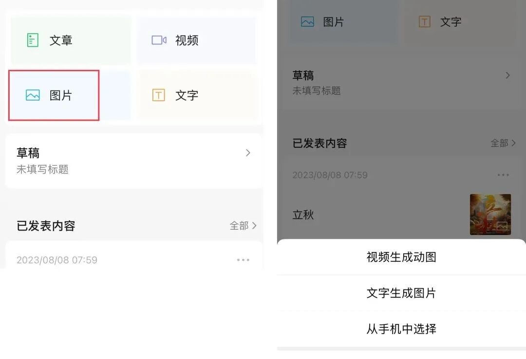 第二步:点击【图片】,会出现三种发表方式,分别是视频生成动图、文字生成图片、从手机中选择,大家可以根据自己的情况来选择发表的方式。