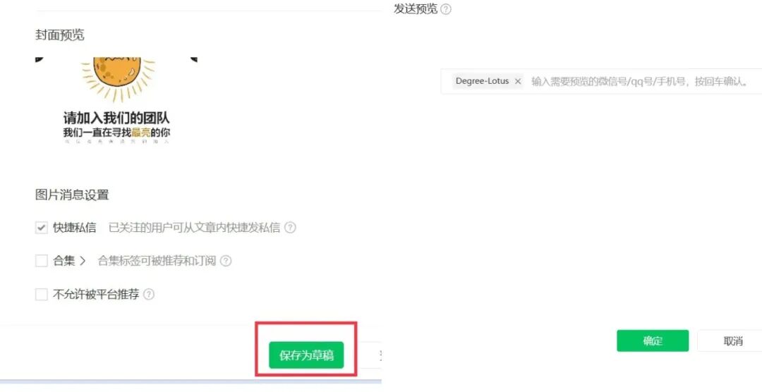 编辑好封面后,点击右下方【保存为草稿】,再点击【预览】,在输入框中输入自己的【微信号】,将编辑好的图片消息发送到手机预览,检查图片消息内容。