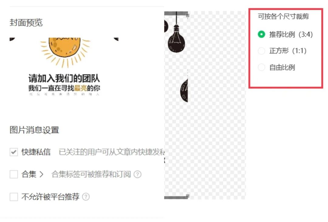 第三步:编辑【封面】, 使用订阅号助手发送图片消息,系统将自动生成封面图,就是图片消息中的第一张图。当然,也可以选择编辑封面尺寸,操作依旧很丝滑。