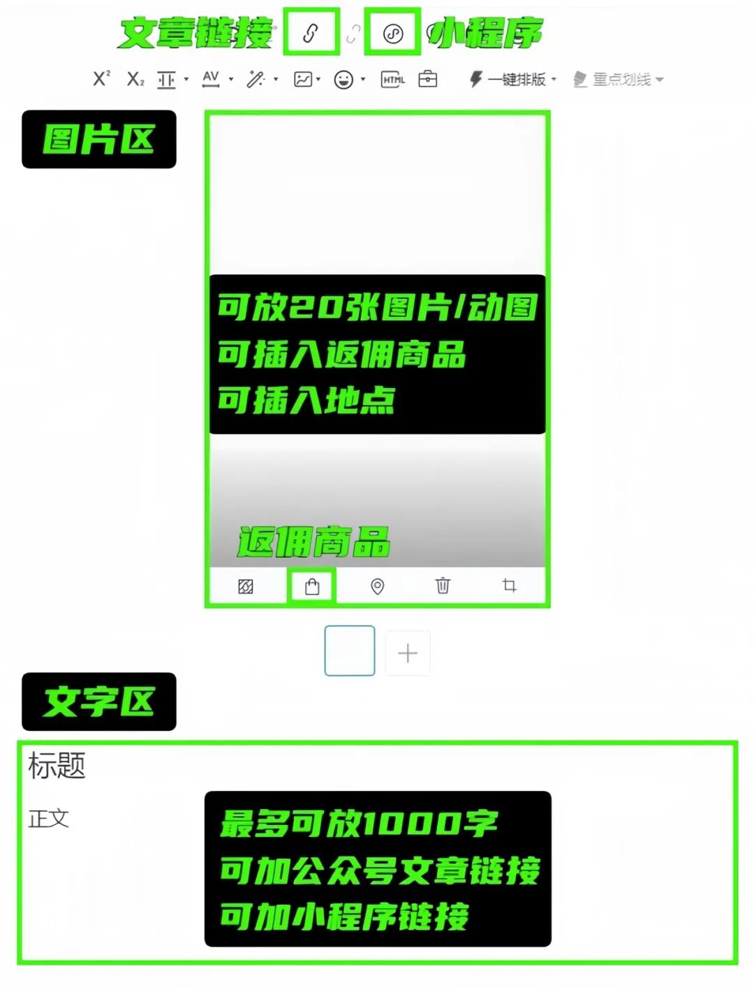 但是,注意,这个小东西比小红书牛B一万倍,因为它打通了整个微信生态,你一不高兴,甚至可以在图文里边插入《文章链接》《小程序》以及《返佣商品》,如图。