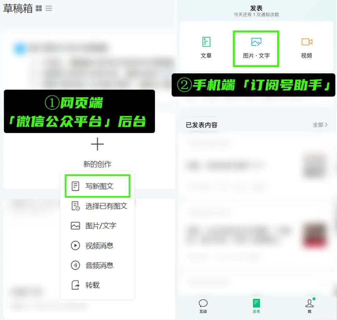 很多人不知道在哪里发布,嗯,2个地方可以发,1是网页端「微信公众平台」后台;2是手机端「订阅号助手」,如图: