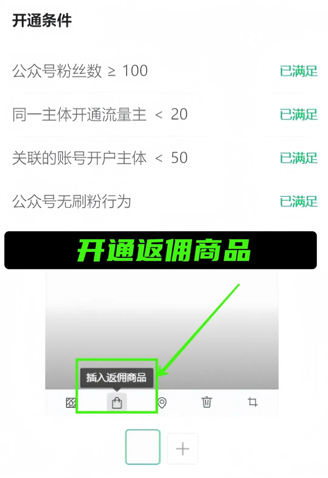 公众号100粉,即可开通“返佣商品”功能,发图文时,插入商品链接,卖出商品即可获得返佣。