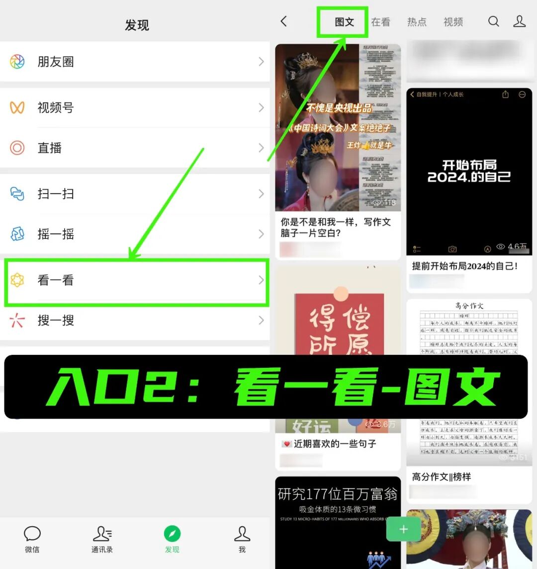 ③看一看➞图文,微信也给了入口。注意,这个入口是去年8月新增的,目前还在内测,部分人能刷到,相信很快全量开放;