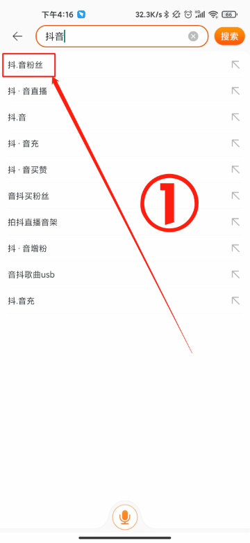 某宝搜索框输入“抖音”,在下方的相关搜索中选择关键词,购买涨粉服务