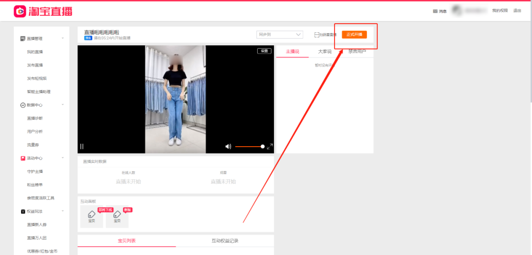 回到“淘宝直播”网页,点击右上角“正式开播”