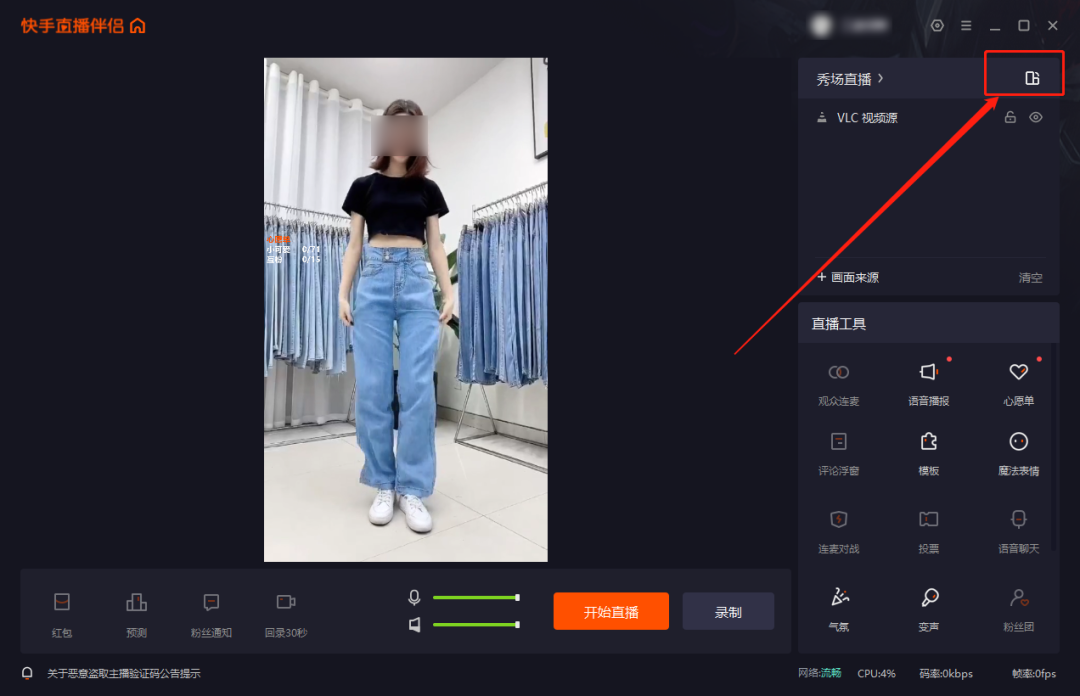 安装“VLC media player”后,重启“快手直播伴侣”
