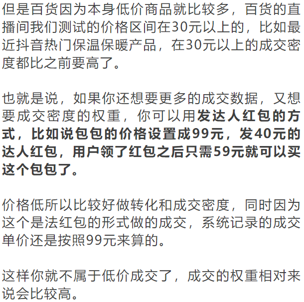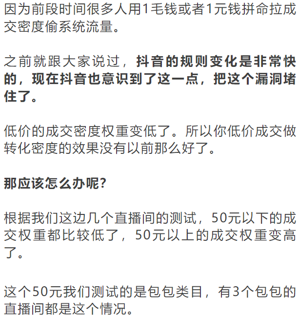 首先先说一个我们自己实操的结果,现在低客单价做成交密度,权重都比较低,有很多直播间9.9或者19.9放一两百单,都不能刺激系统给你推第二波流量了。