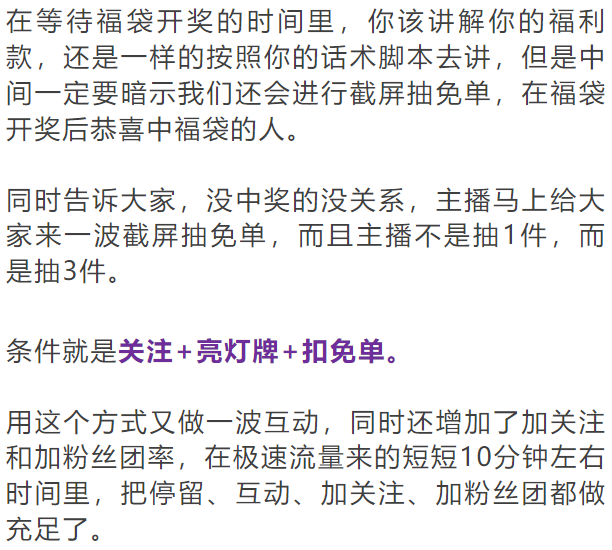 福袋可设置条件(如关注主播,并且成为粉丝团成员即可抽奖),同时拉动停留与互动,为产品介绍腾出时间。在用户等待抢福袋的几分钟时间内,快速过款,介绍爆品吸引用户。