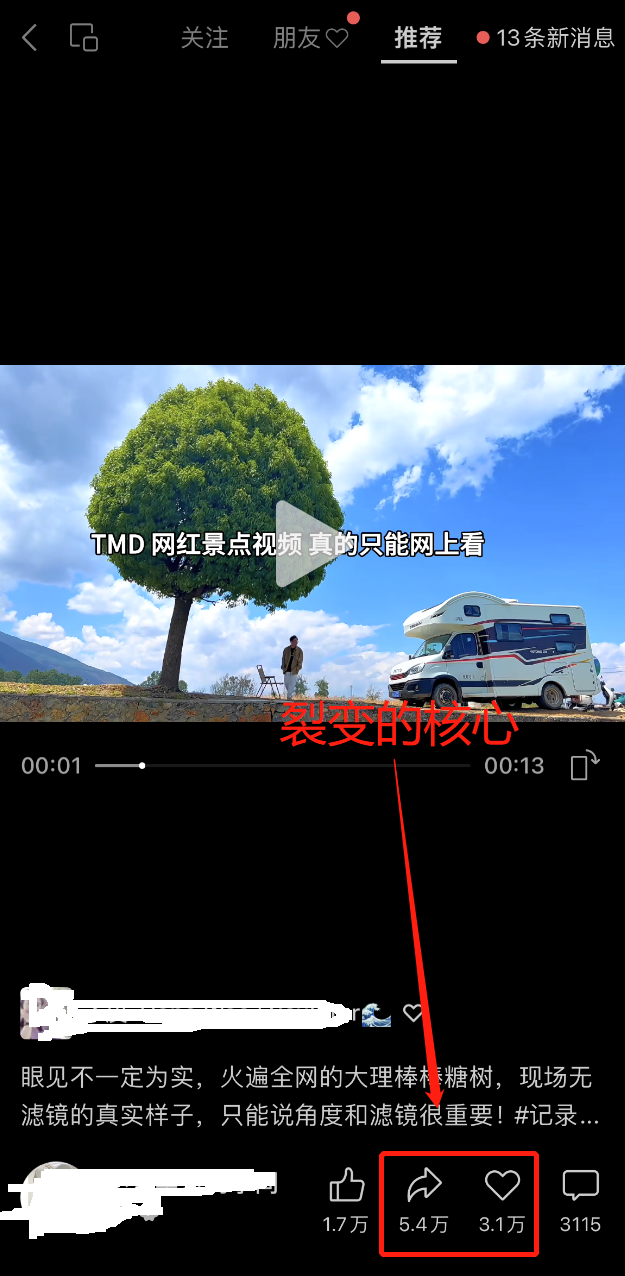 当你点赞了一个视频、或者转发到朋友圈一个视频之后,你微信好友会收到红点提示,提示你看过这个内容,进行裂变传播推流。所以视频一定要确保用户有转发的欲望。