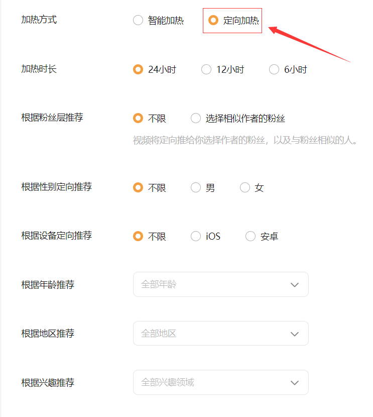 建议选择定向加热,定向加热可以让我们自己设置精准的目标人群,让流量转化效果更加友好。