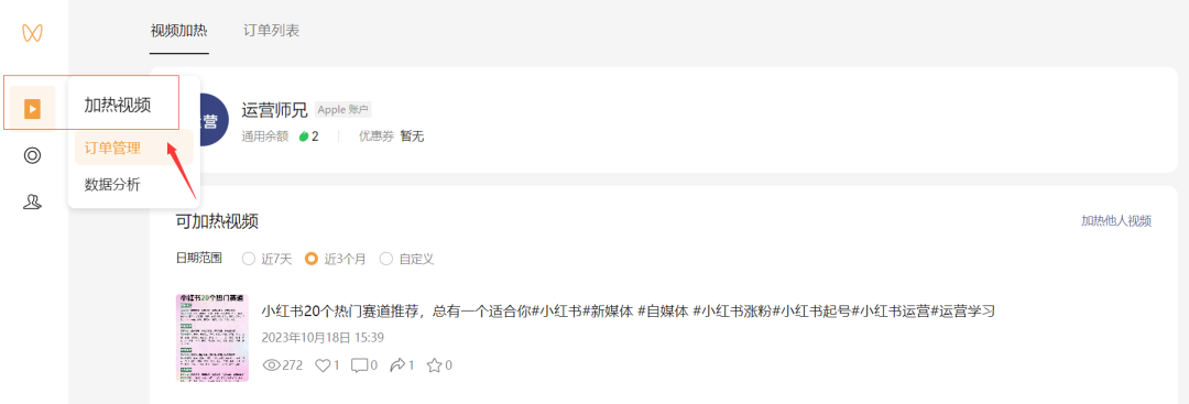 4、选择可加热的视频,点击最右侧的发起加热按钮,进行加热目标设置
