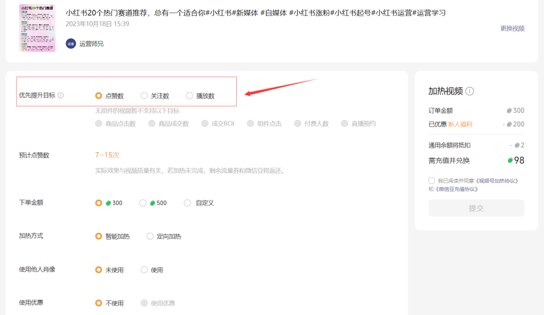 5、进入视频加热设置页面,需要设置提升目标、下单金额。