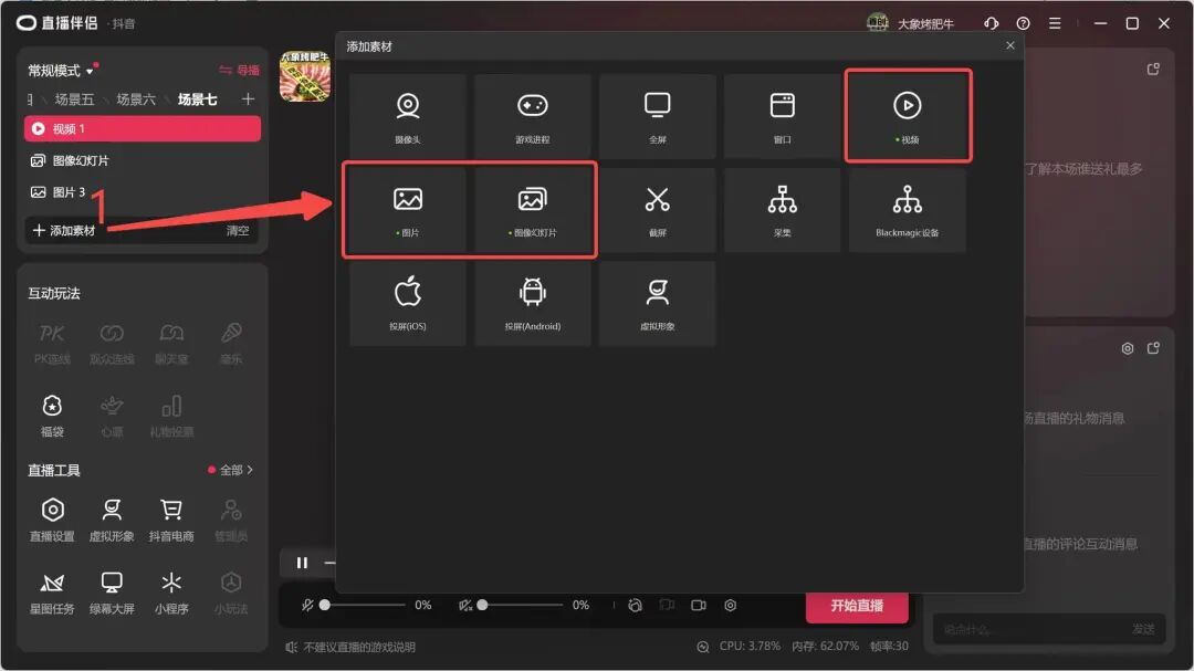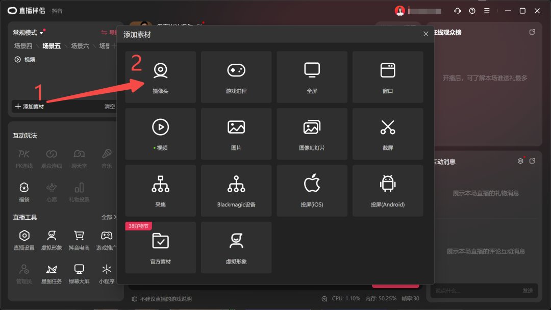 首先,我们需要使用虚拟摄像头软件。抖音官方提供的直播伴侣就是一个很好的选择。通过该软件,我们可以搭建好素材并启用右下角的虚拟摄像机功能。