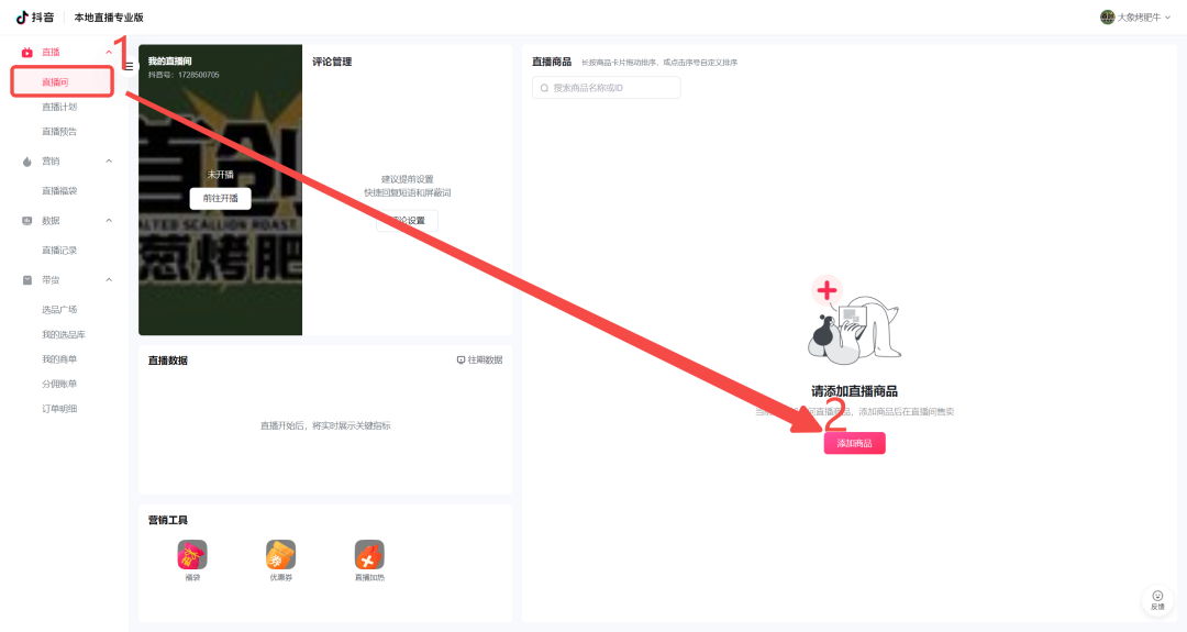 点击“直播间”,添加商品即可