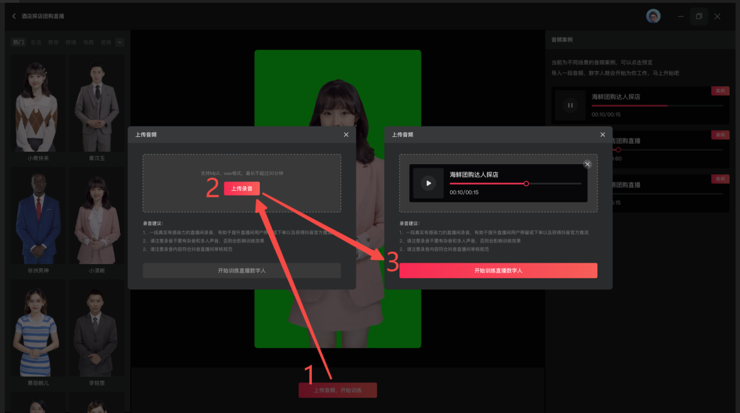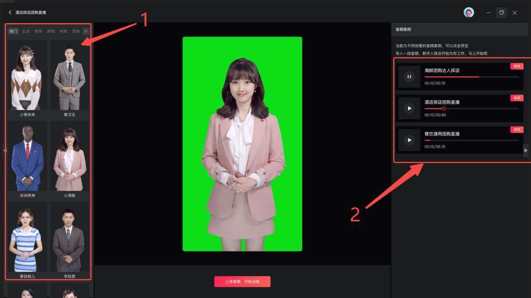 可点击右侧音频案例,预览数字人直播效果