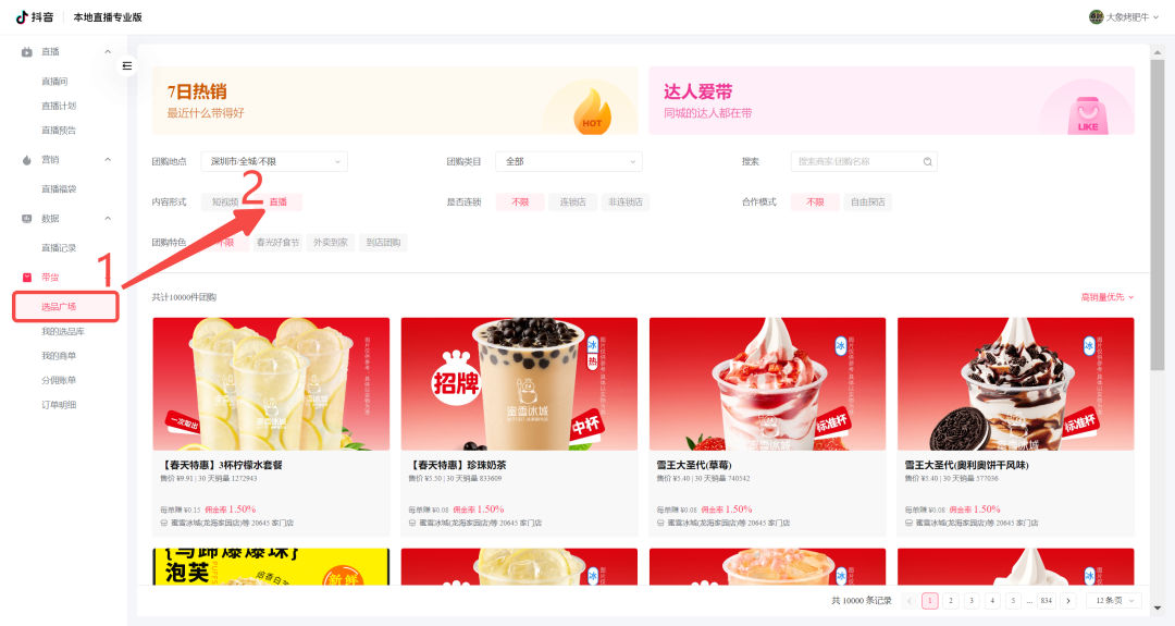 点击抖音直播专业版(网址),根据提示登录抖音号,进入选品广场,选择团购商品。
