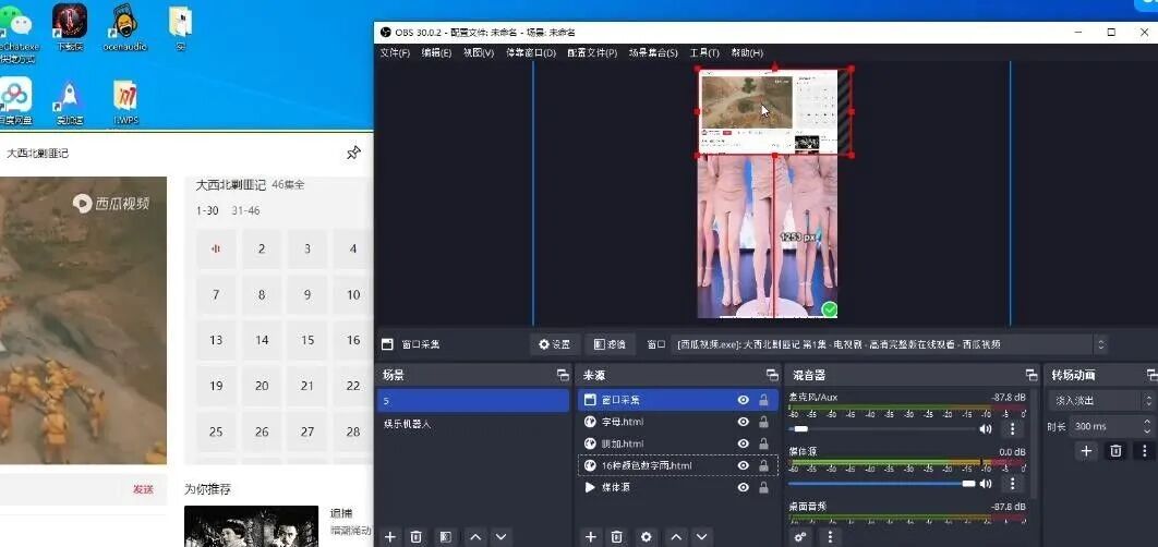 随后,打开西瓜视频,并选择一个电视剧,将其窗口采集到OBS中,并进行相应的滤镜设置。