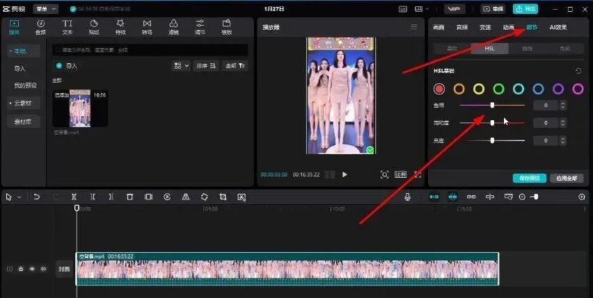 1、首先要打开剪映,并在项目质量中对主素材进行去重。接下来,将主素材拖放到时间轴上,并稍微延长它的显示时间。然后,调整画面的大小和色彩,包括色相、饱和度和亮度等参数。完成调整后,将画面比例设置为9:16,适合在抖音上使用,然后导出视频。