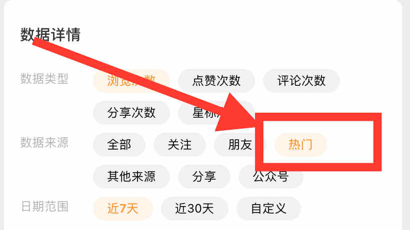 4. 在“数据详情”下的“数据来源”子项中选“热门”标签即可查看热门数据
