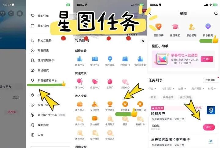 入驻之后,打开抖音,点击右下角的“我”,点击右上角的“☰”,然后再点击创作者服务中心。里边有任务要求,按照任务要求去发布作品,就可以有收益了,播放量越高,收益就会越多。